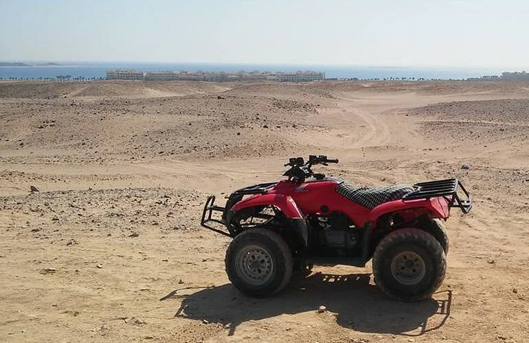 Unsere Quad-Tour beginnt an der Station und führt uns tief in die faszinierende Makadi-Wüste. Wir fahren über die Sanddünen und durch abwechslungsreiche Landschaften und Hügel. Die Aufregung und das Adrenalin werden uns begleiten, während wir die rasante Fahrt genießen. Auf dem Weg zum Strand erwarten uns beeindruckende Ausblicke und die Schönheit der Wüste. Besonders bei den Touren, die um 15:00 Uhr starten, können wir den Sonnenuntergang in vollen Zügen erleben, während wir entlang der Küste fahren.